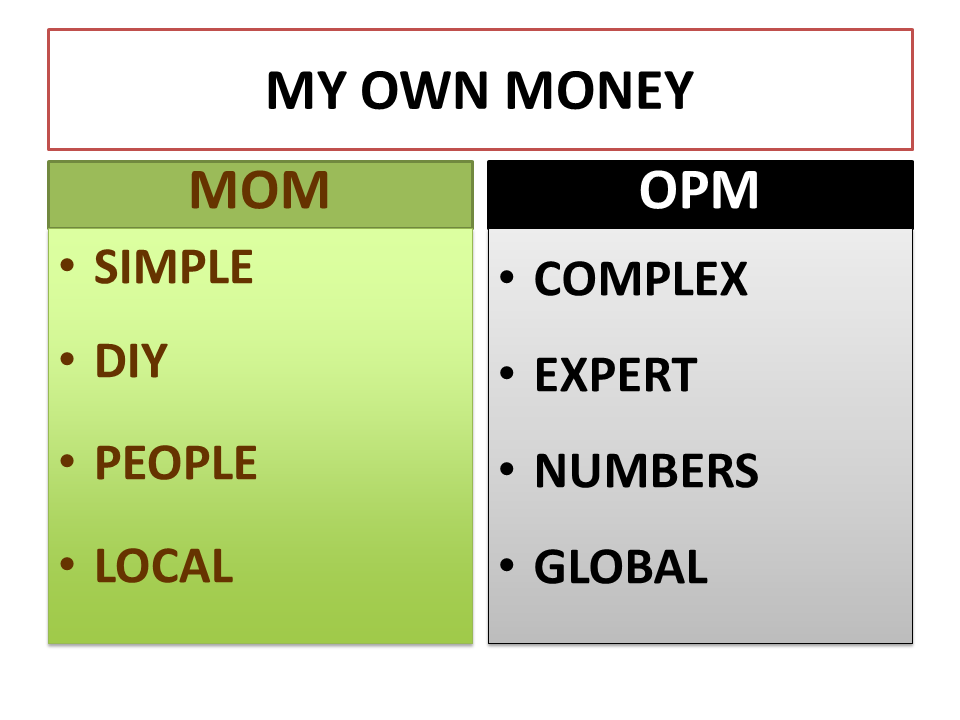 For decades Finance professors taught to use OPM: Other People's Money to invest in Wall Street and global, complex investments that require a professional to manage. This system failed in 2008.