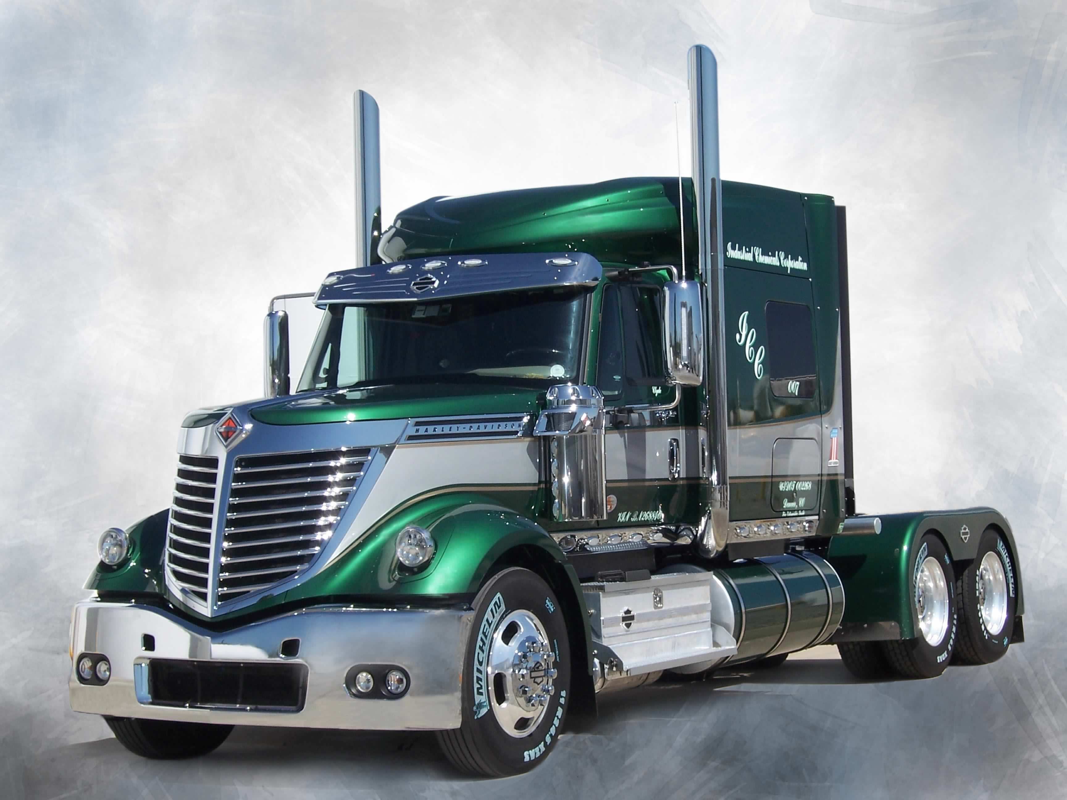 - Truck - The truck should resemble an international lonestar (files: wallpapers_international_lonestar2009_1.jpg and AUT-07-BK0012-01P and Clyde's painting). The truck should be black with a purple two tone (purple stripe). The truck should be driving threw the gate/portal (partly on the one side of the gate as it is coming threw)