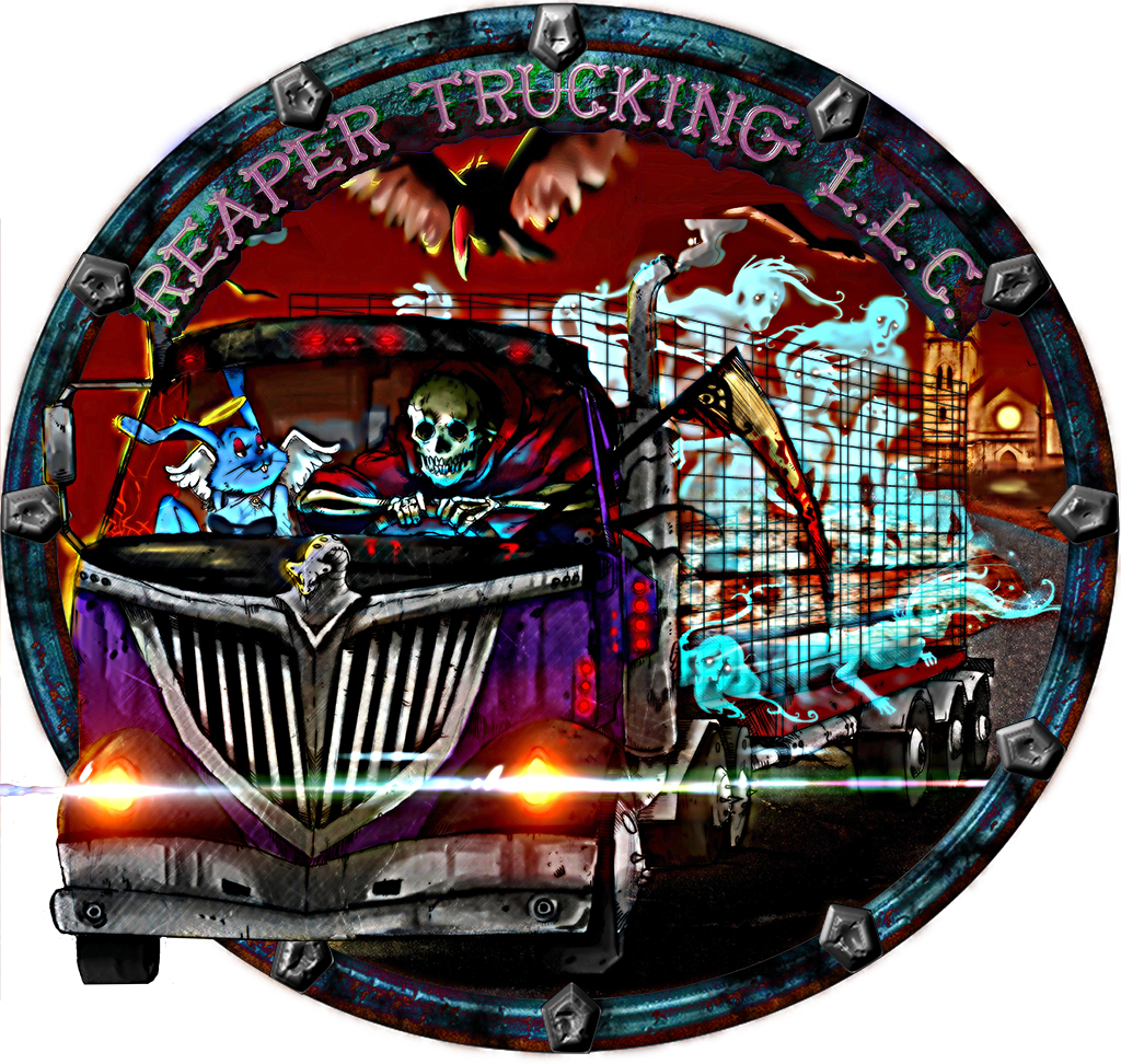 The Dimensional Gate was my first idea, but could also do it with a TEAR GRAPHIC, so it looks like a dimensional portal opened on the side of the trucks (pretty simple concept).. As long as the business name "REAPER TRUCKING L.L.C." flows with the graphics...