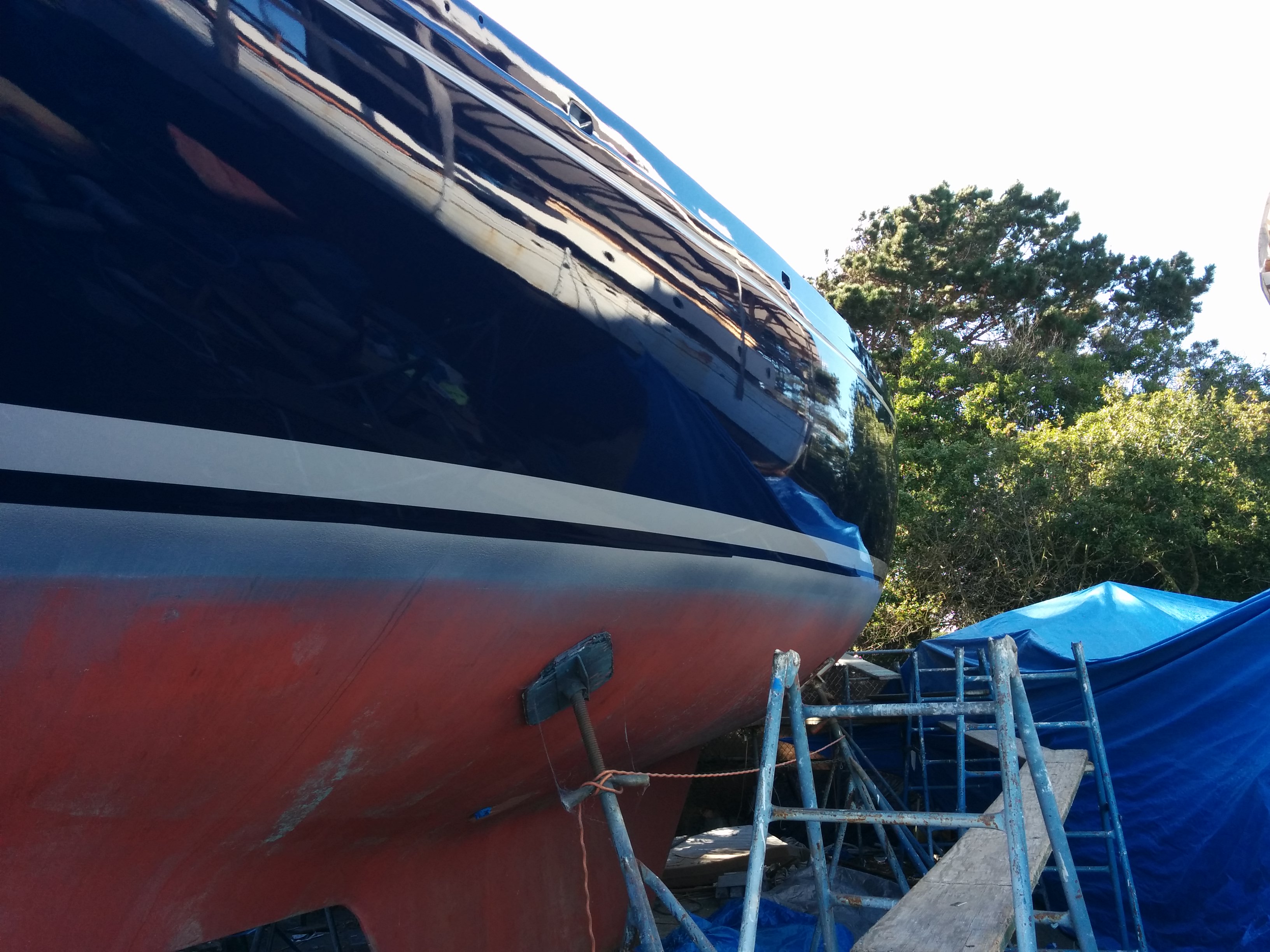The color of the boat is Blue (Hull) with medium grey strips for cove and waterline (see photo). Colors in logo should work with boat colors. (Awlgrip paint colors are Carinthia Blue and medium gray - awlgrip.com)