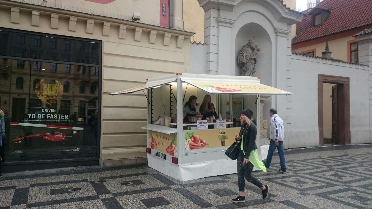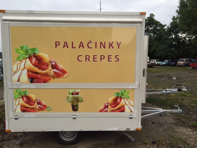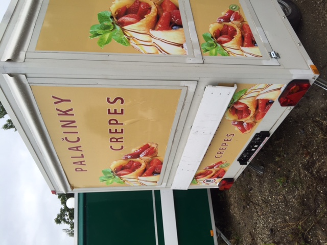 See the enclosed photos of the food stand from the front and the sides. The size of the food stand’s plan view is 2.5 x 2 meters (8.2 x 6.56 ft). The design can be either in the size of the current stickers (which would be replaced by yours) or it can cover the whole stand.