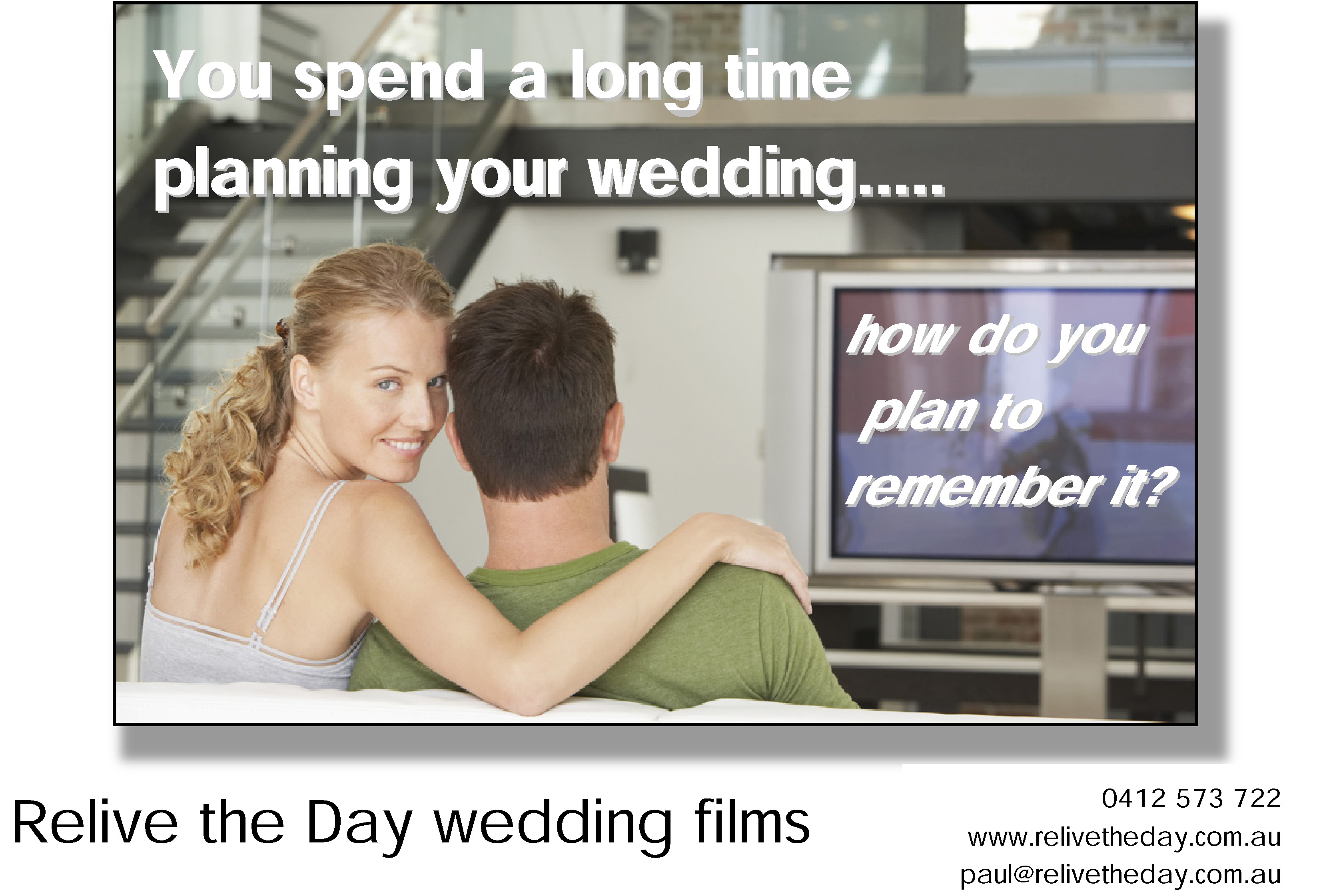 I need an advert that makes the bride stop and think about getting a wedding video, that makes her want to check out our website & facebook page or call or email us.