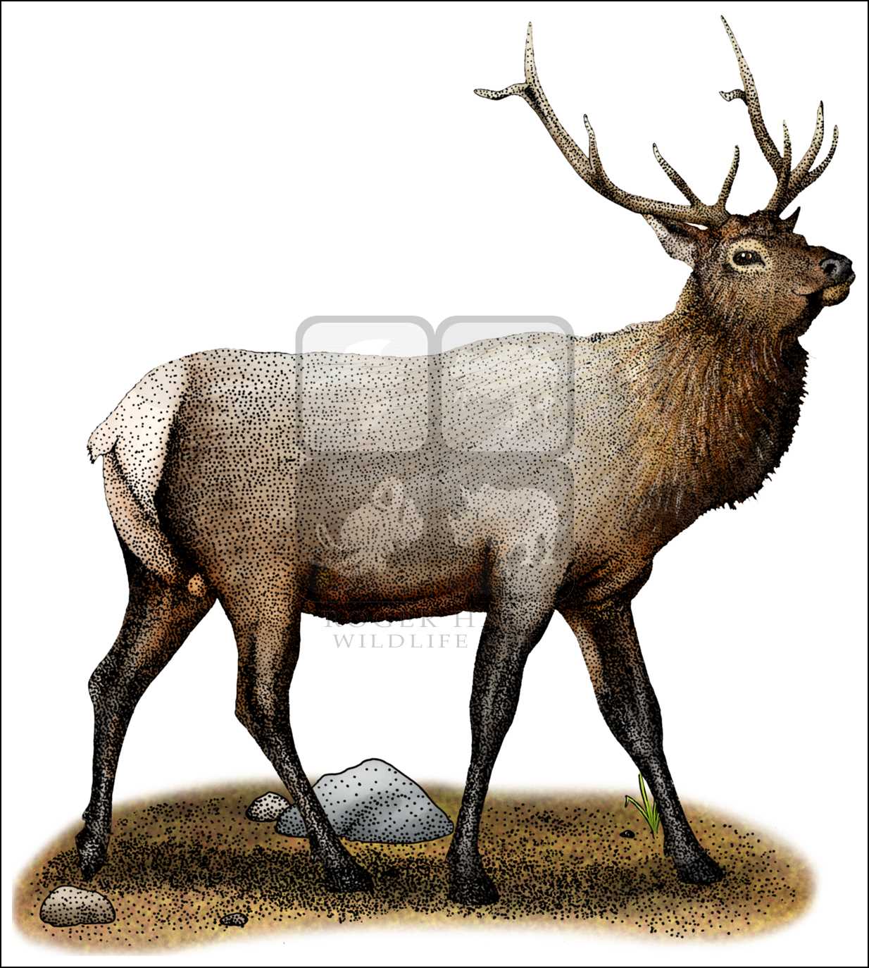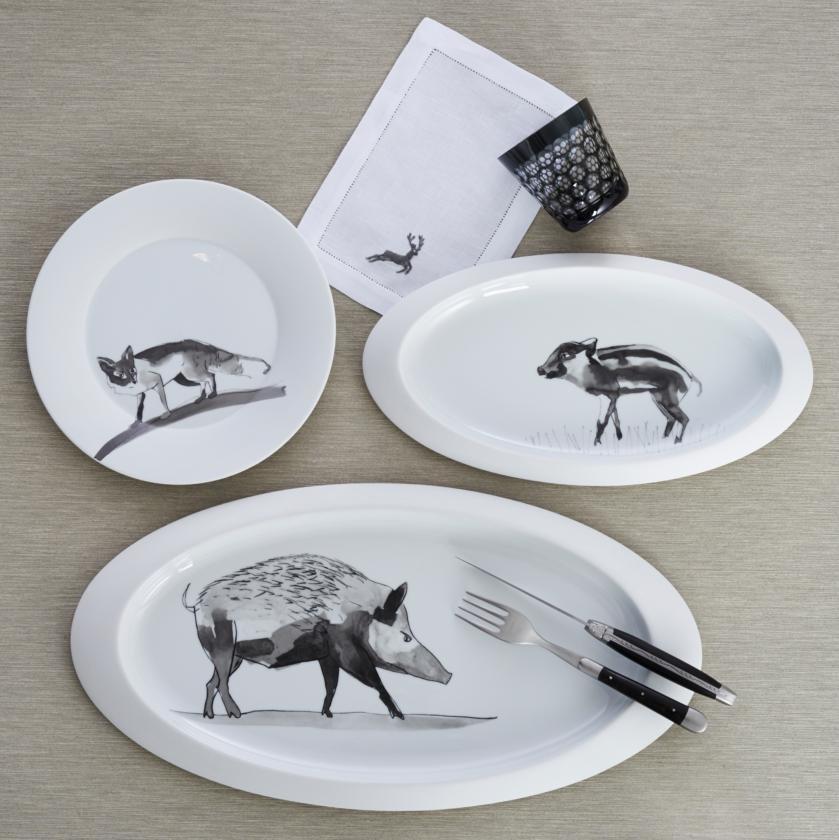 Design an illustration for a 4-piece dinnerware set that includes a dinner plate, salad plate, bowl, and mug. The four illustrations will feature: 1) elk, 2) wild boar, 3) grizzly bear, 4) wild turkey