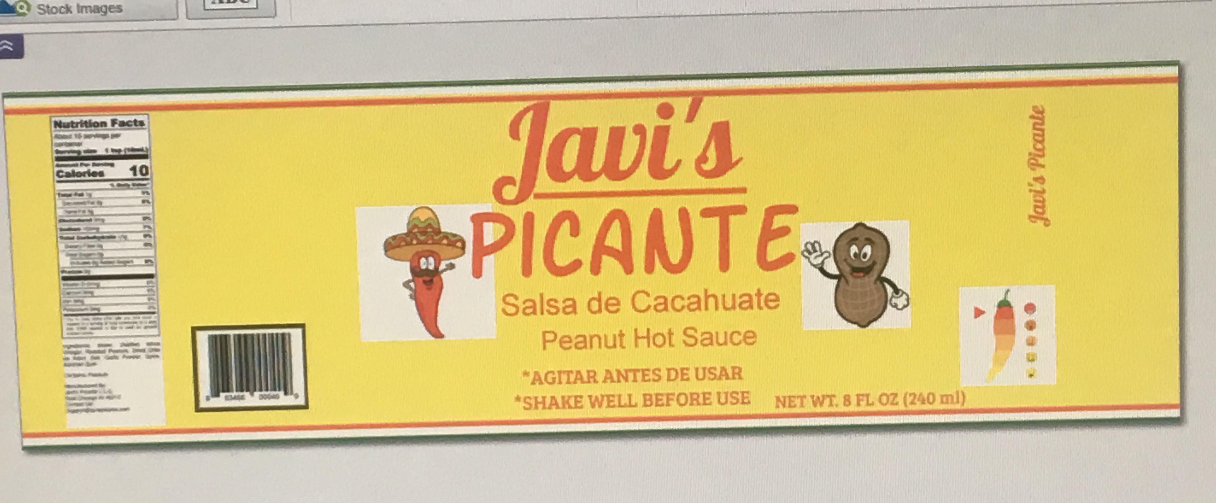 We need a Label design for a new company named 'Javi's Picante'. We manufacture a Mexican hot sauce called as the name implies 'Picante'. We would like to see designs that include colors that catch the eye and show that the sauce is spicy, such as yellow or red as you can see the sauce itself is orange so a label that goes well with the sauce. included in the files is the first bottle example and an example of a label we came up with which is kind of what we wanted. we also need the barcode and nutrition label to be included in High definition in the label since it will be sold in stores. We also need the label to say things in ENGLISH AND SPANISH as shown in the sample label since our primary market is both to English and Spanish speakers. The final design should be both in English and Spanish. have spicy eye catching colors and have the included nutrition label and barcode in a good quality definition. the measurements we will use for the label are 7" x 2.25" please also add "refrigerate after opening" to the label along with the other text like the one that says "shake well before use"