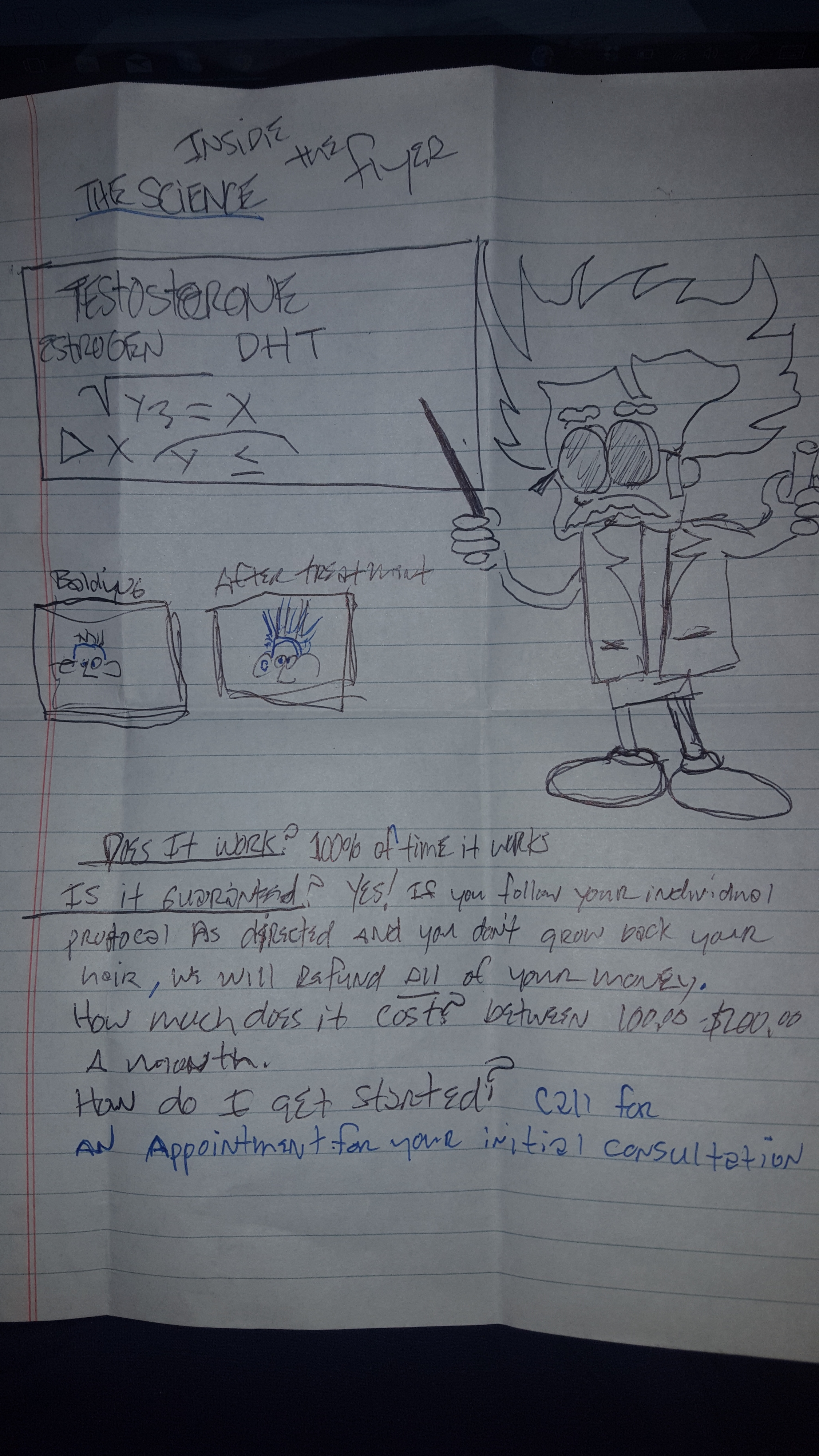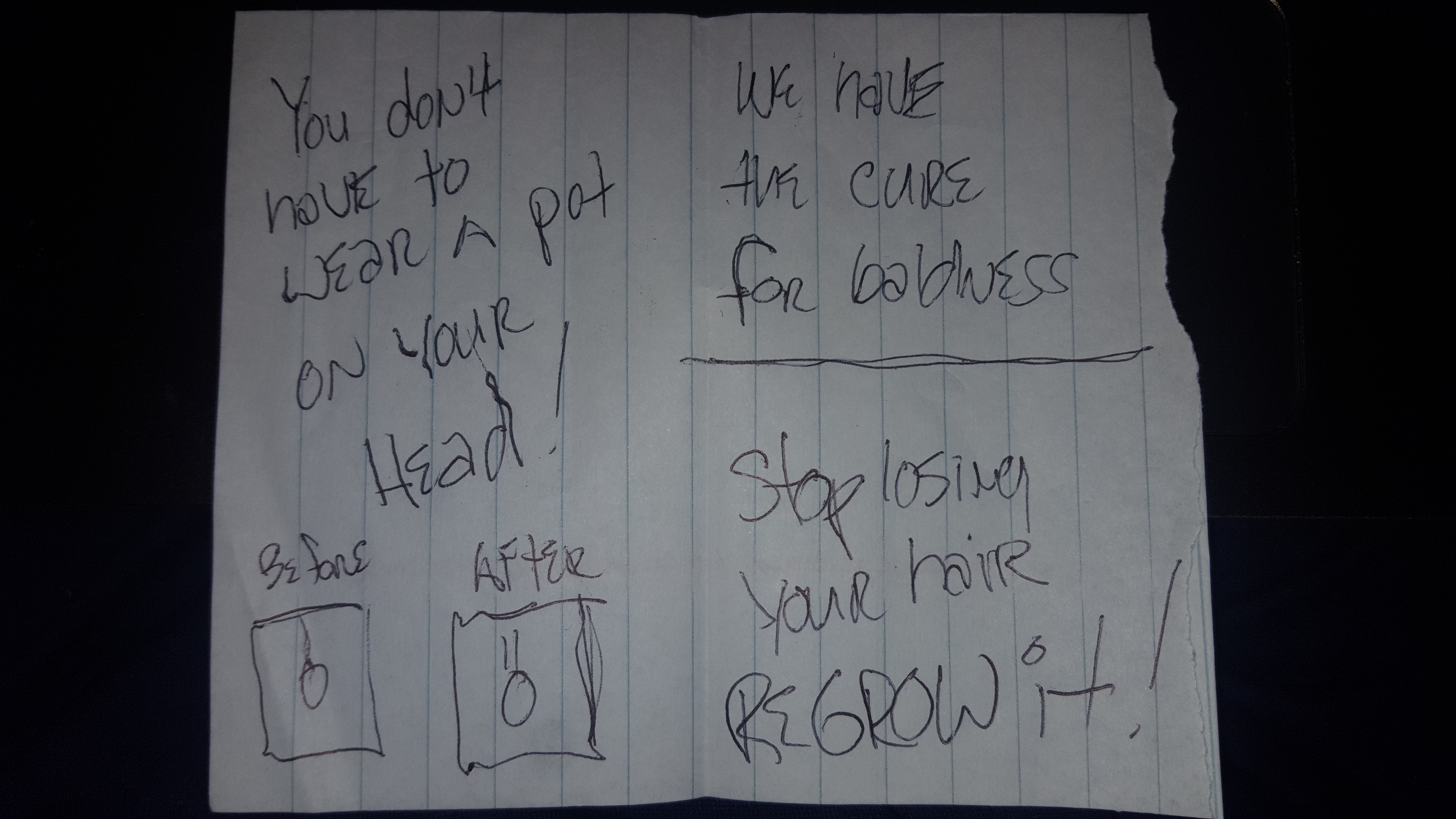 Most men are embarrassed by their hair loss. We are looking for a flyer that can be handed from one guy to another to let him know that there is a solution to his problem and that it works and then let him know he can call us or look at our website for more information.