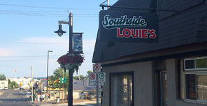• - a street scene with the signs of local businesses