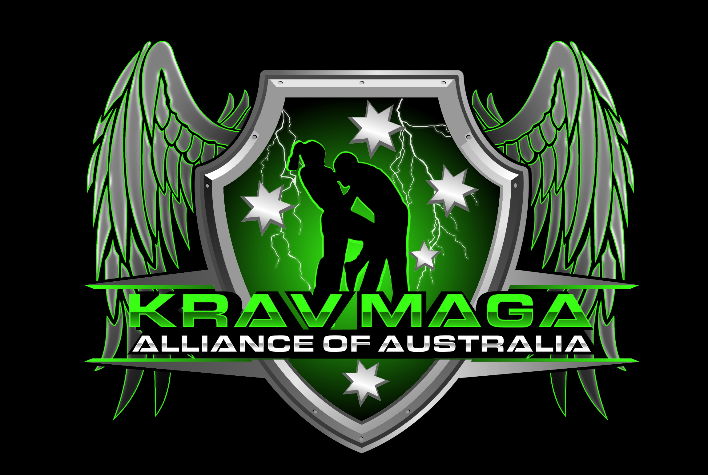 "Krav Maga Alliance of Australia" to be across the chest area, please refer to logo in uploaded files to see how we would like it styled and stick to similar font and design as written in the uploaded logo. Please incorporate either a shield or southern cross or the silhouette from our logo design into the front chest print. Again use only fluorescent green and grey colours with black background.
