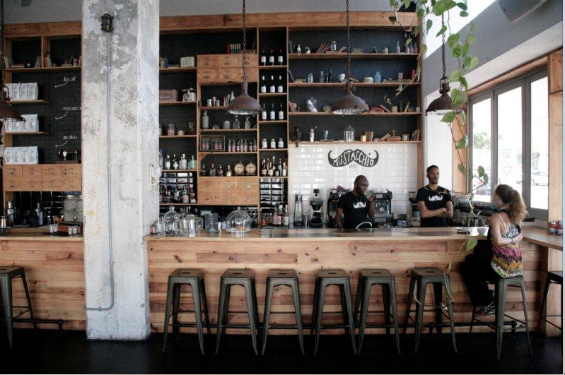 We need a name and logo for a hip and happening coffee bar that features in an international commercial. Hipsters frequent it, and we have a few guys with very similar beards, so maybe a graphic beard can be part of the logo? We see the name and logo in floating letters on the window of the coffee bar, also inside, maybe on a menu and on a take away coffee cup. Keep it simple, graphic and modern. It will either be in white, gold or black, please do in those 3 colours. Please look at references - guidelines to the type of spot we are talking about.