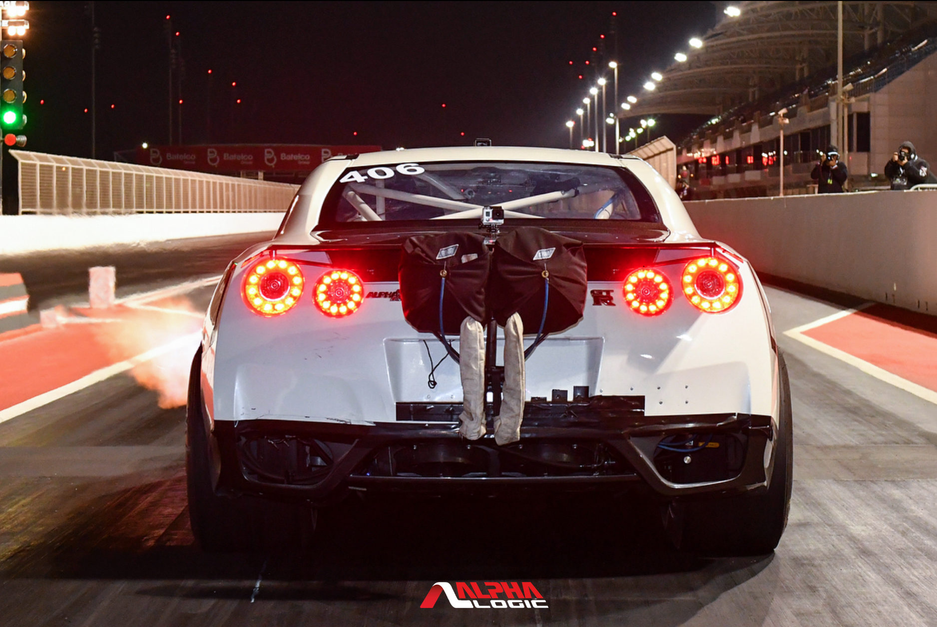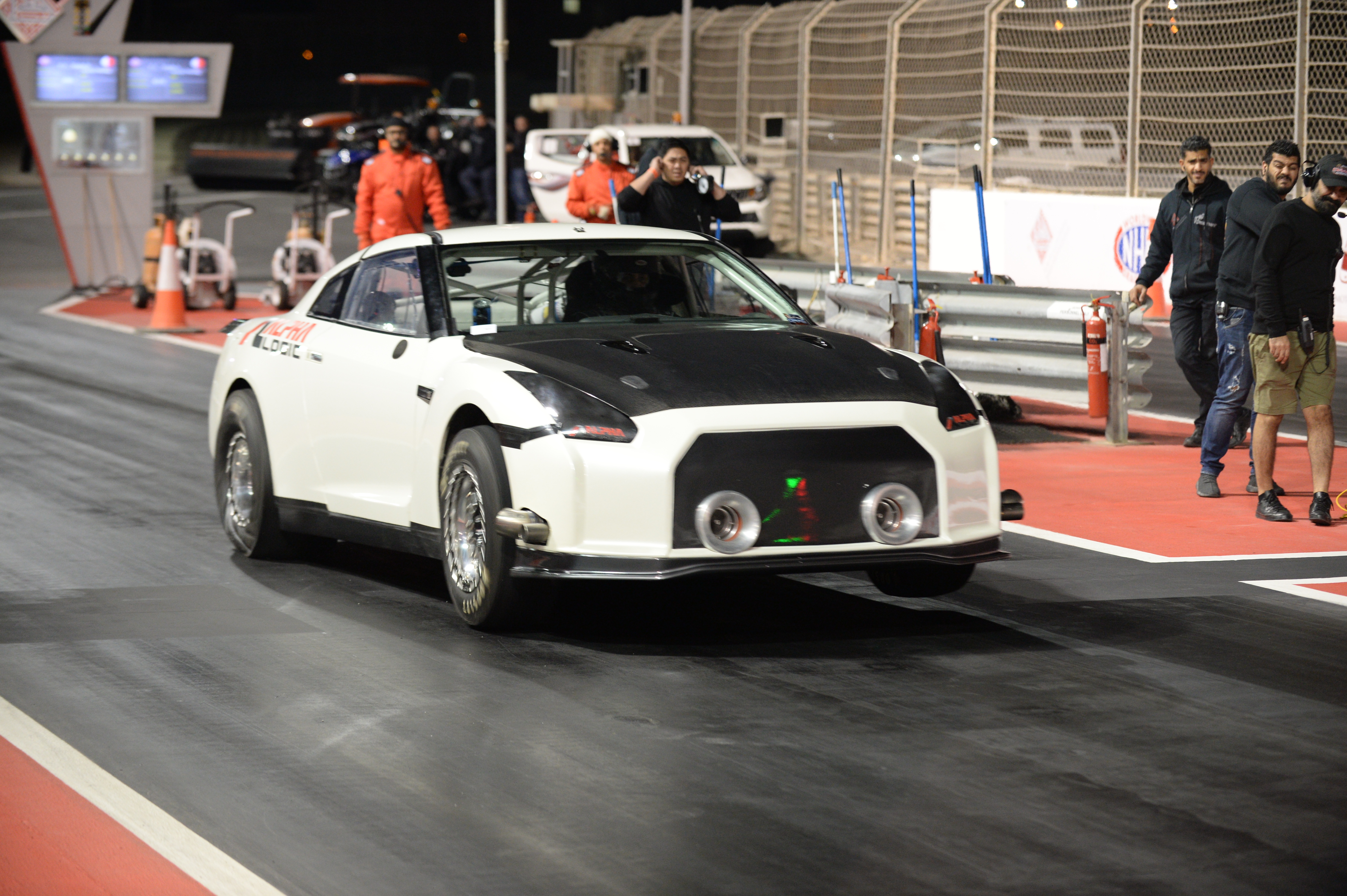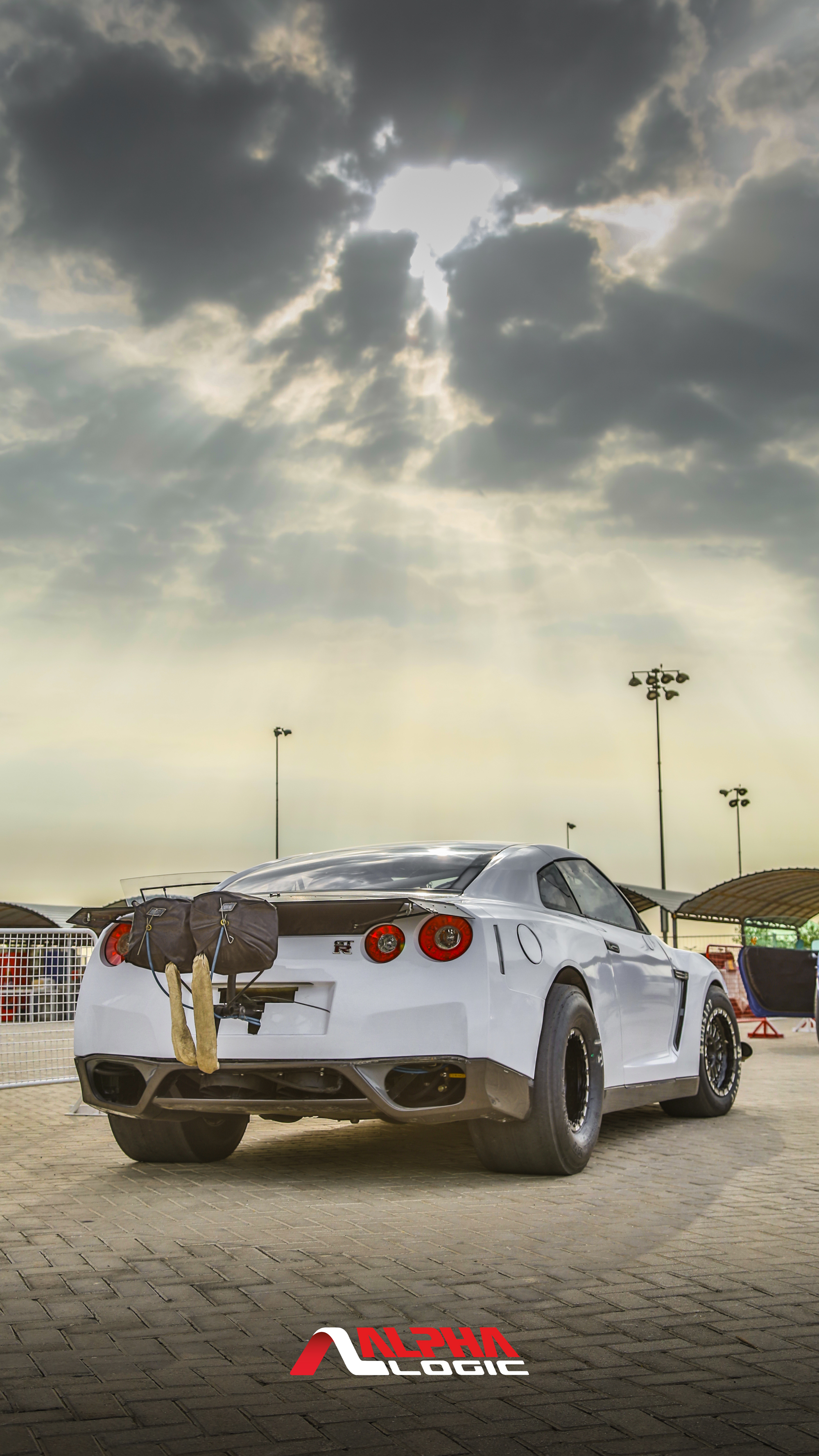 Design a T-shirt using photos of the white car showing the time board which is pictured (6.789 358.10) and saying "World's Quickest GT-R" similar to the two attached examples but less cartoon-ish. Also incorporate the company (Alpha Logic) logo