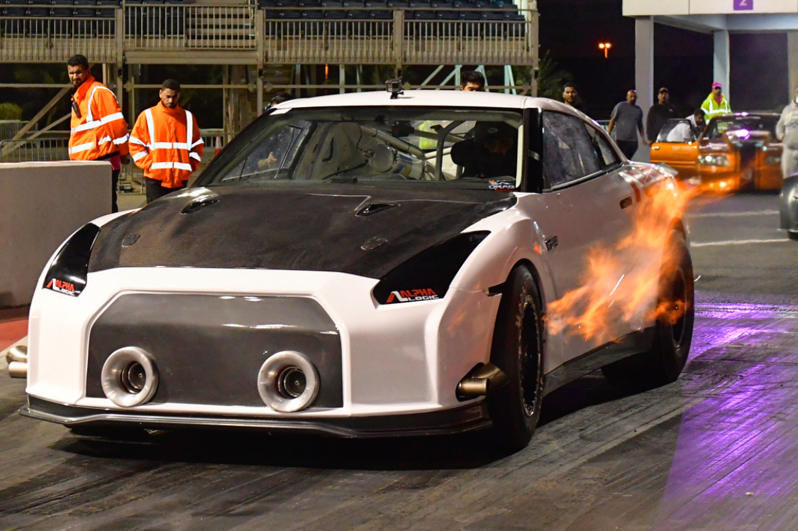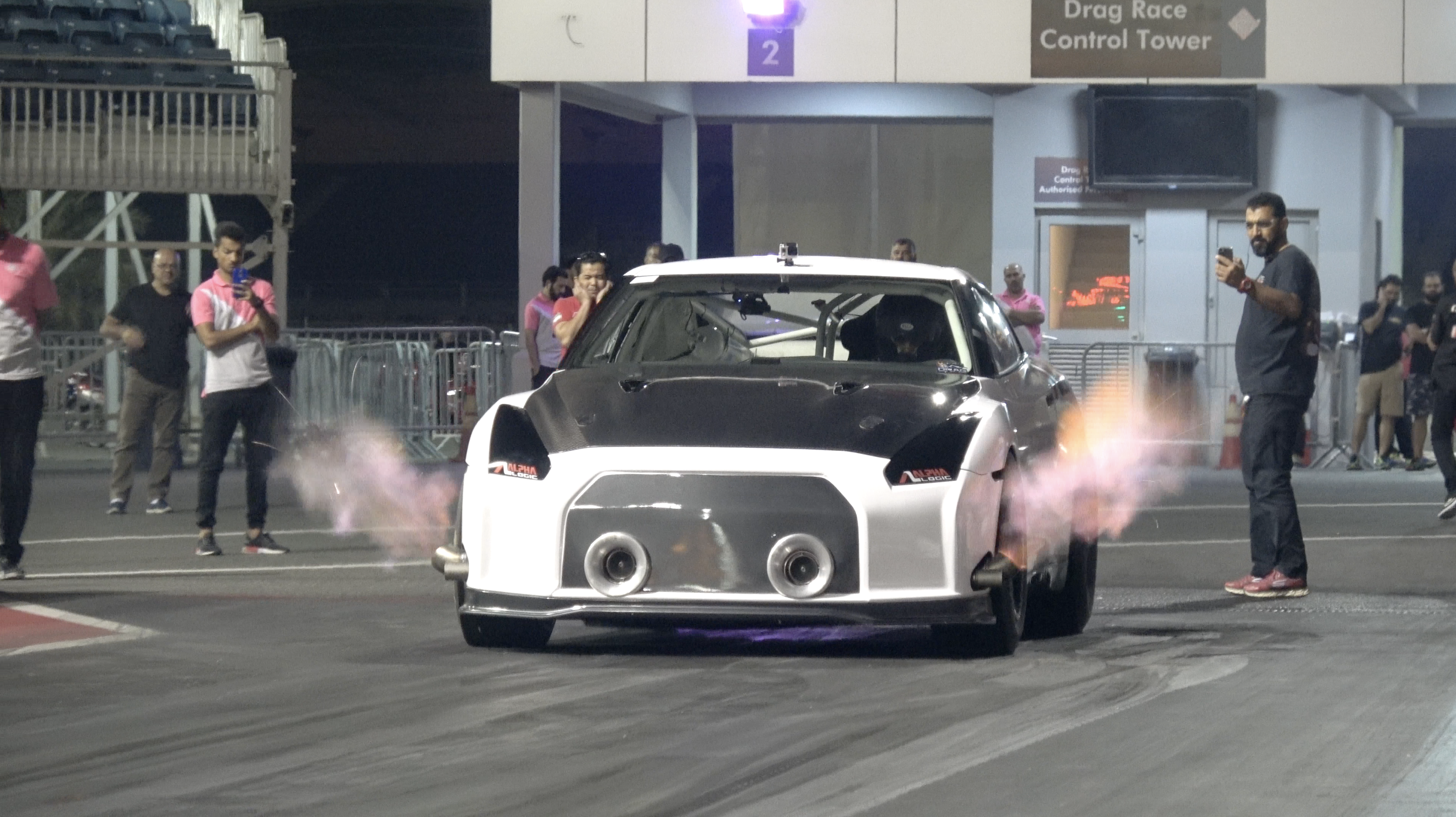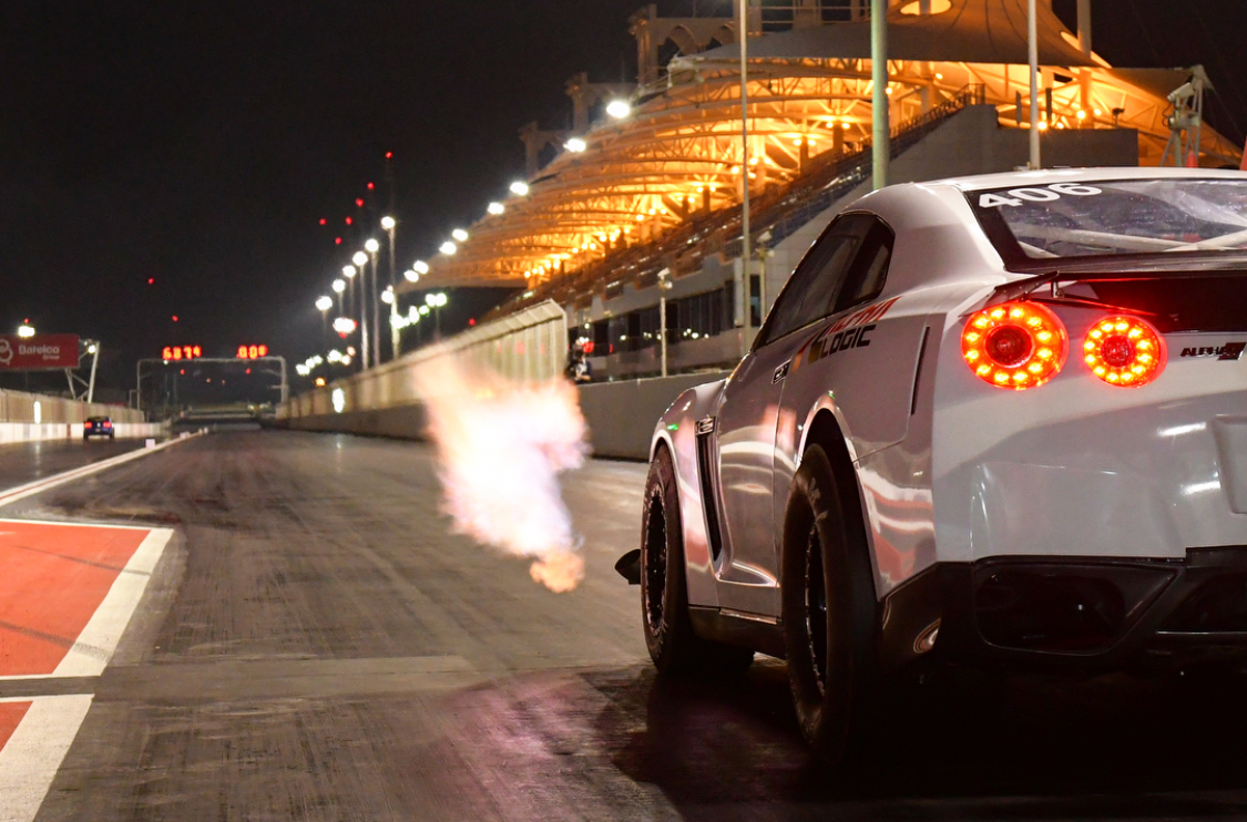 Design a T-shirt using photos of the white car showing the time board which is pictured (6.789 358.10) and saying "World's Quickest GT-R" similar to the two attached examples but less cartoon-ish. Also incorporate the company (Alpha Logic) logo