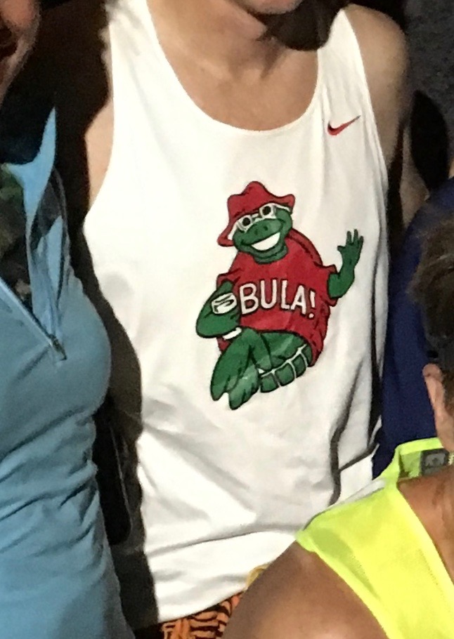 Photo 2 - A hand-drawn runner (with turtle logo on singlet) and the traditional, Fijian sulu worn by Team Bula runners