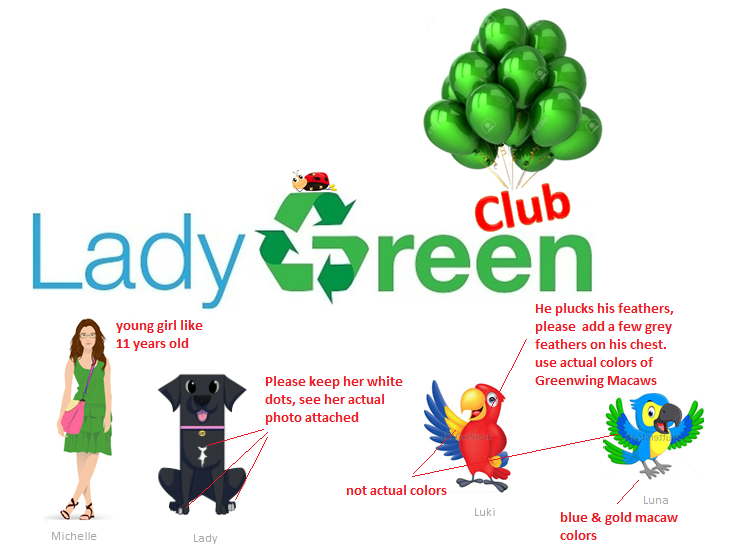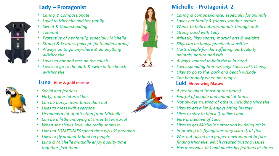- Must have unique features as described and seen on the documents/photos attached. Please get creative with Michelle character (her clothes) and keep my features as seen on the pics. Michelle can wear a lady green shirt with shorts or jeans but make her look youthful and like a kid. Think I want my hair lose rather than picked up (long wavy dark brown hair). See video attached.