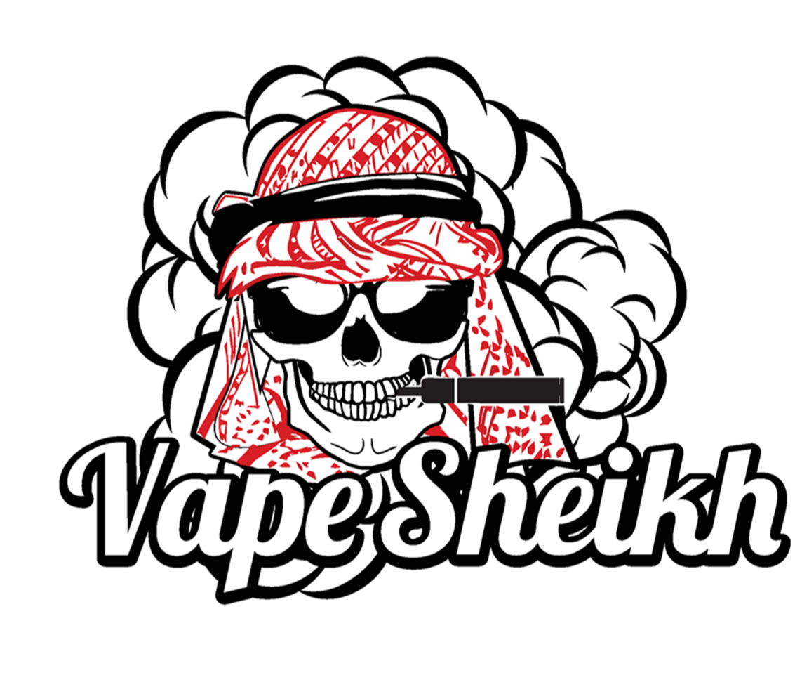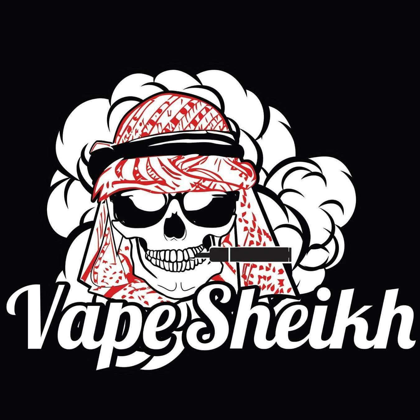 • Vapesheikh , An arabian dead skull face sheikh wearing his red&white traditional scarf with could behind and vaping Ecig and little clouds coming is coming out of it. Vapesheikh in cool letters.