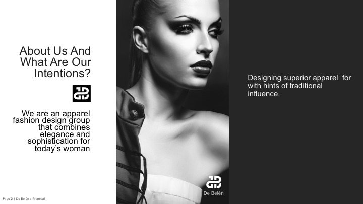 We need a logo design for a startup company for designer apparel, that translates across multiple forms of media. The logo should be sleek and sophisticated with a hint of modernism and focus on the letters "D" and "B" in the company name "De Belén." This logo will be used in garment design, and possibly as two parts of belt buckles, buttons and etc. or other apparel. The idea is to produce an iconic look that will work as a single product or in conjunction with the company name spelled out. Please see attached slides (Slide 1, particularly) for ideas, which is an idea of what we are envisioning for our marketing efforts. The color palette and type should reflect a clean and classic look, with a hint of modernism.