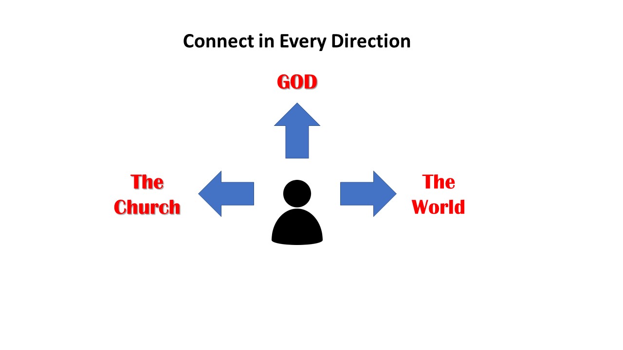 Considering those new pics, I would remove the words "up, in, out" and put in "god, the church, the world". I would put "connect in every direction" somewhere in the design. I would try to represent how we want to connect each person in each of those directions. Lastly, I would try to show a connection between those three things and a person.
