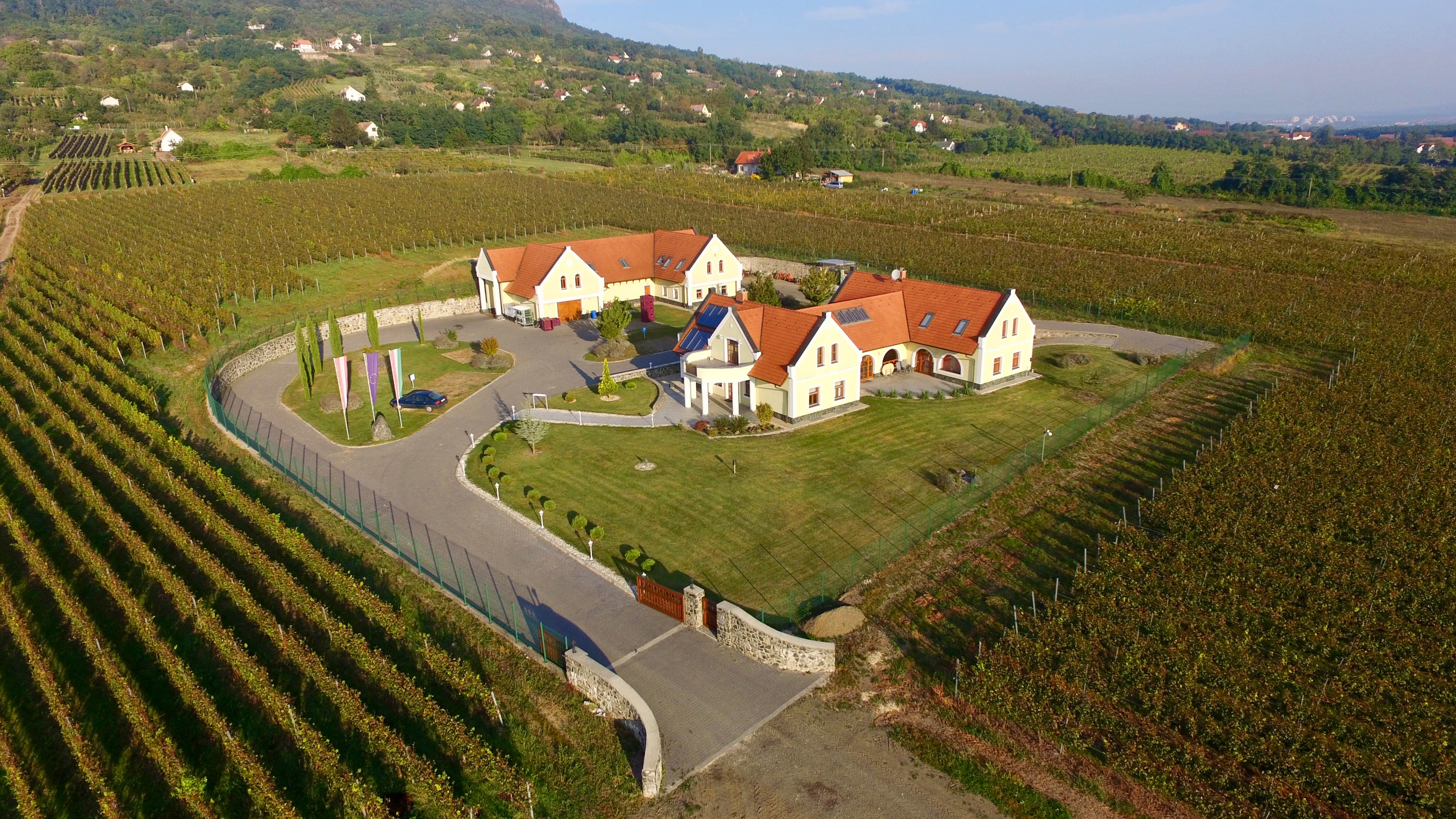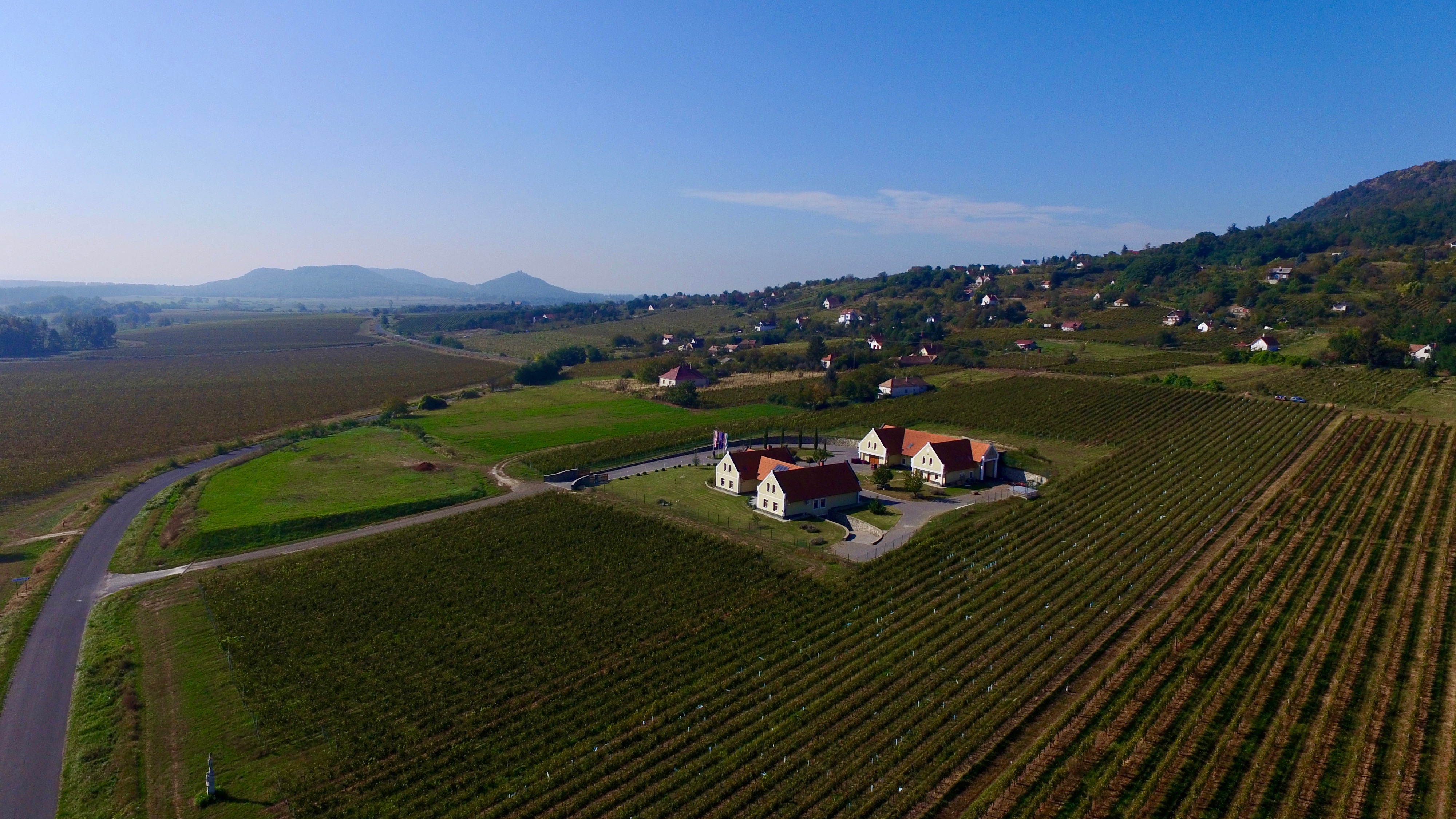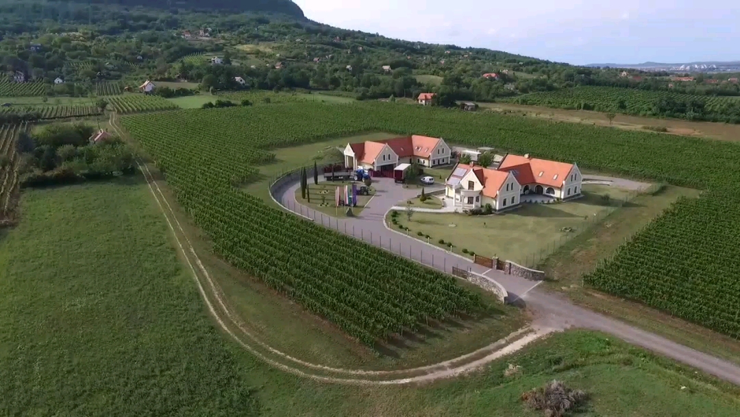 We need an illustration for a label and a folder based on 2 photos. The style should be like the sample label on the sailboat bottle. This can be very artificial or modern, it should definitely be modern and simple. The perspective should fit, not exactly as in a photograph, but the arrangement of the two buildings should be unmistakable in the foreground, with the volcano in the background.