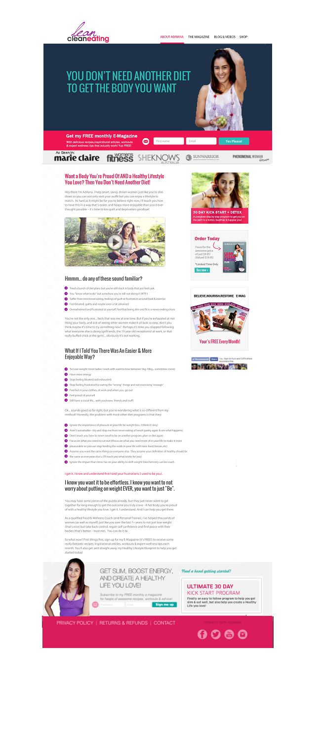 It's time for a redesign of the home page for Adriana Solorzano's "Lean Clean Eating" website (www.leancleaneating.com). We have a VERY clear idea of what we want, so it really won't take a talented designer long to bring it to life.