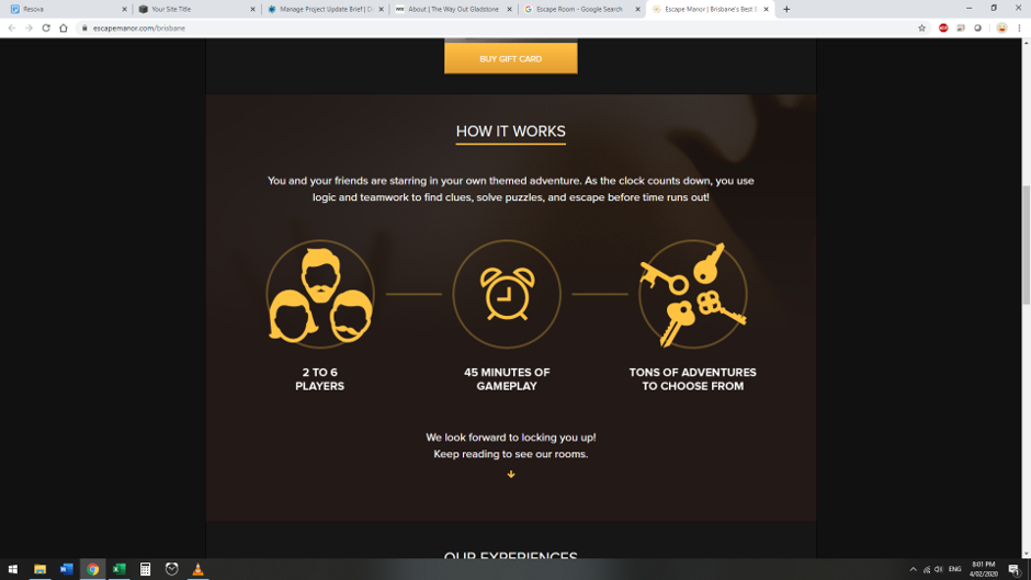 Escape Room Website. Bookings and scheduling of appointments will be organised with Resova through the site. Most appointments will be created online through the booking system with some payments coming through in person by drop-ins. Groups will be from 2 - 8 people with a sliding scale of prices. We will start with one game playable and one saying coming soon. We will also eventually have 4 games up and running at once so will need it to be able to expand. We don't have any images of the rooms because it all relies heavily on mystery. Appointments are each 1 hour long with 30 minutes in between.