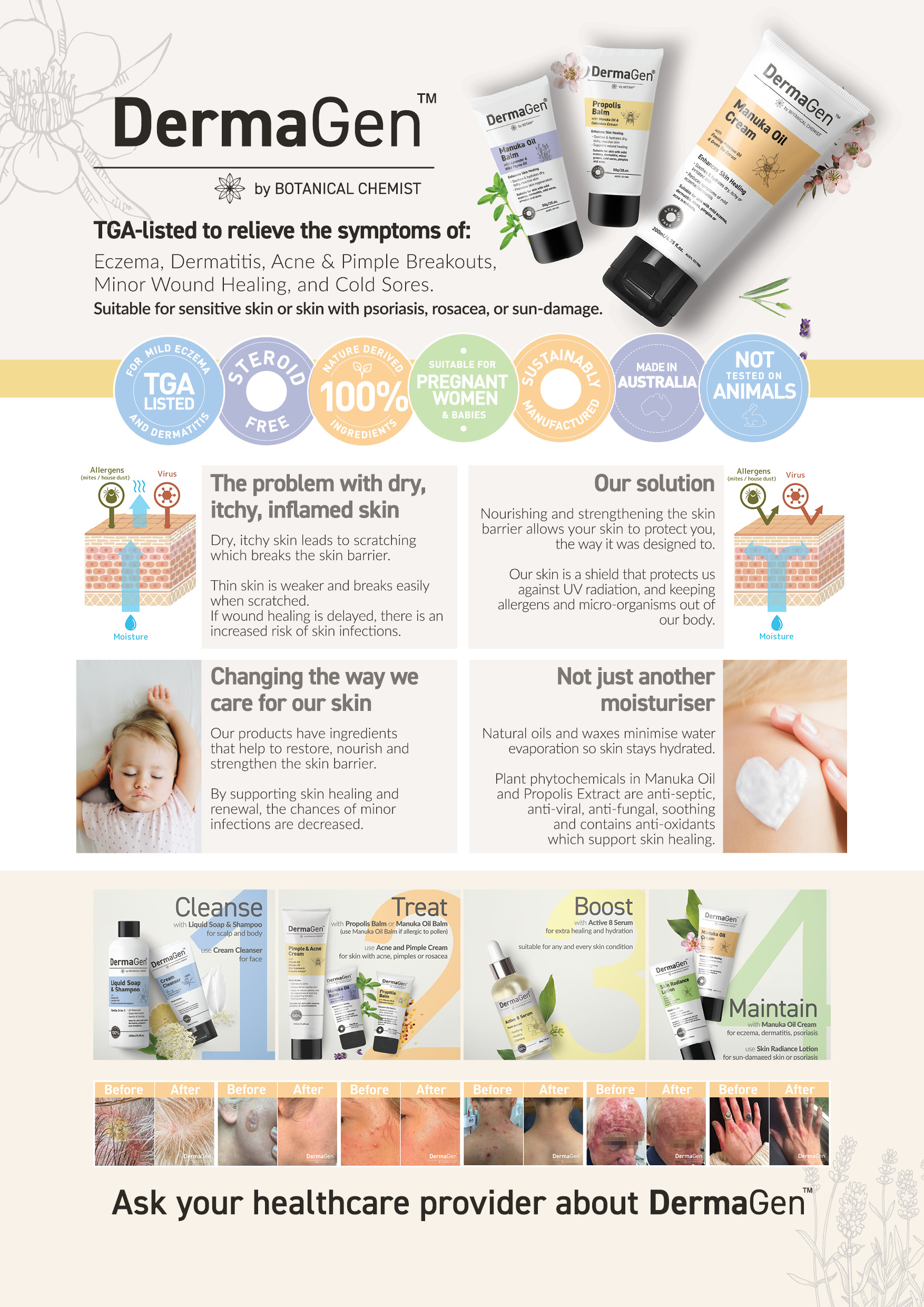 - Made in Western Australia using 100% nature-derived ingredients. Re-cyclable packaging. Best used with our Propolis Balm for concentrated healing, and Active 8 Serum for better hydrating and calming properties. Heal your skin with the finest ingredients from nature. Similar colours and branding design elements ie colours, fonts, style, as in the Brand Collection PDF. Consistency with existing ad material. See leaflet attached on Sun Damaged Skin.