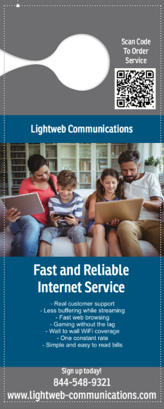 We are a startup internet service provider in Colorado, and we need some marketing materials. We provide internet service to home and business. This is a competitive market so we need something that will catch our potential customers eye. Lightweb Communications offers fast and reliable internet service without the headaches. No long term contracts or special promotions that expire and raise your rate. We offer a simple monthly rate with bills and features that are easy to understand.