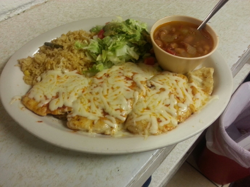 ENCHILADA PLATE 3.99 - two enchiladas rice and beans
