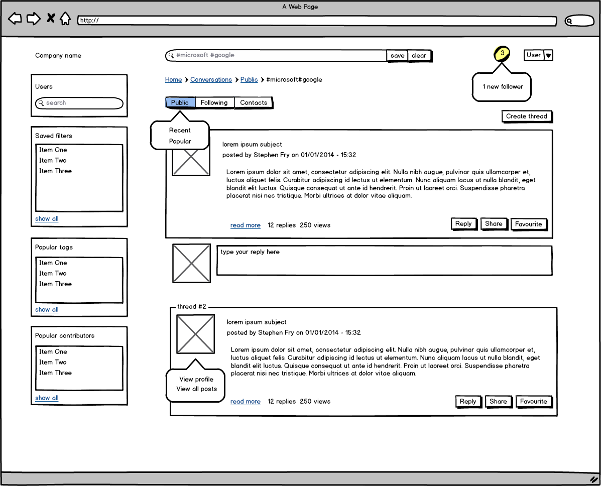 1- Public/Following/Contacts: should feel like these are separate forumpages (public forum, forum for personal contacts)