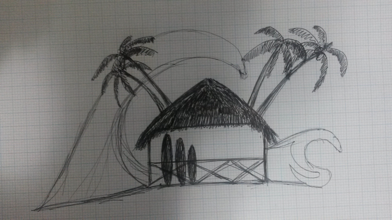 I need a logo for my surf school, restaurant and resort business in Indonesia. The logo should be classy and fun. Bold lines show the strength of the company. I would like blue and black to be the color of choice with a 'shack' as the focal point. Palm trees in there could add a touch of the tropics and must include a wave or wave barrel subtly. The restaurant sits on the water itself and we run surf lessons for beginners.