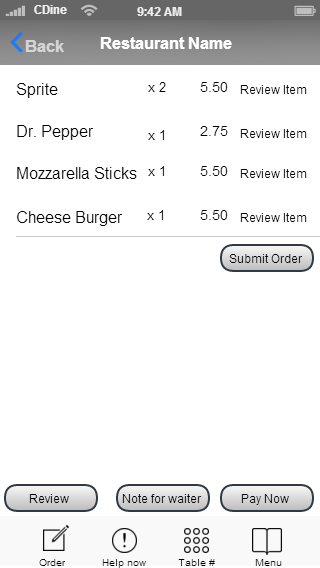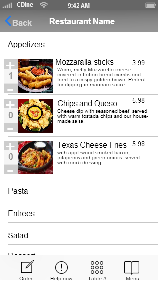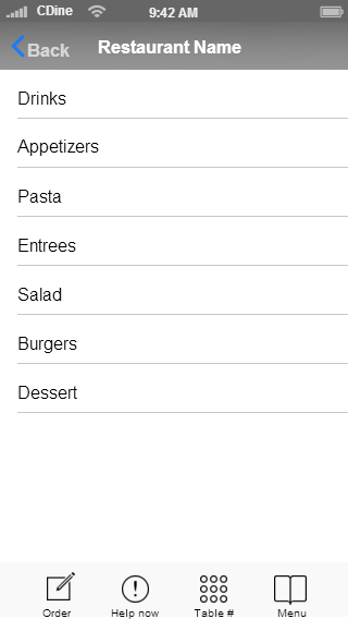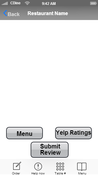 1. The Home screen to the restaurant. (call it American Cuisine) You can redo the buttons to make it look better. Like have a logo or something better than box buttons. Please use good looking easy to read fonts, Modern you might say.