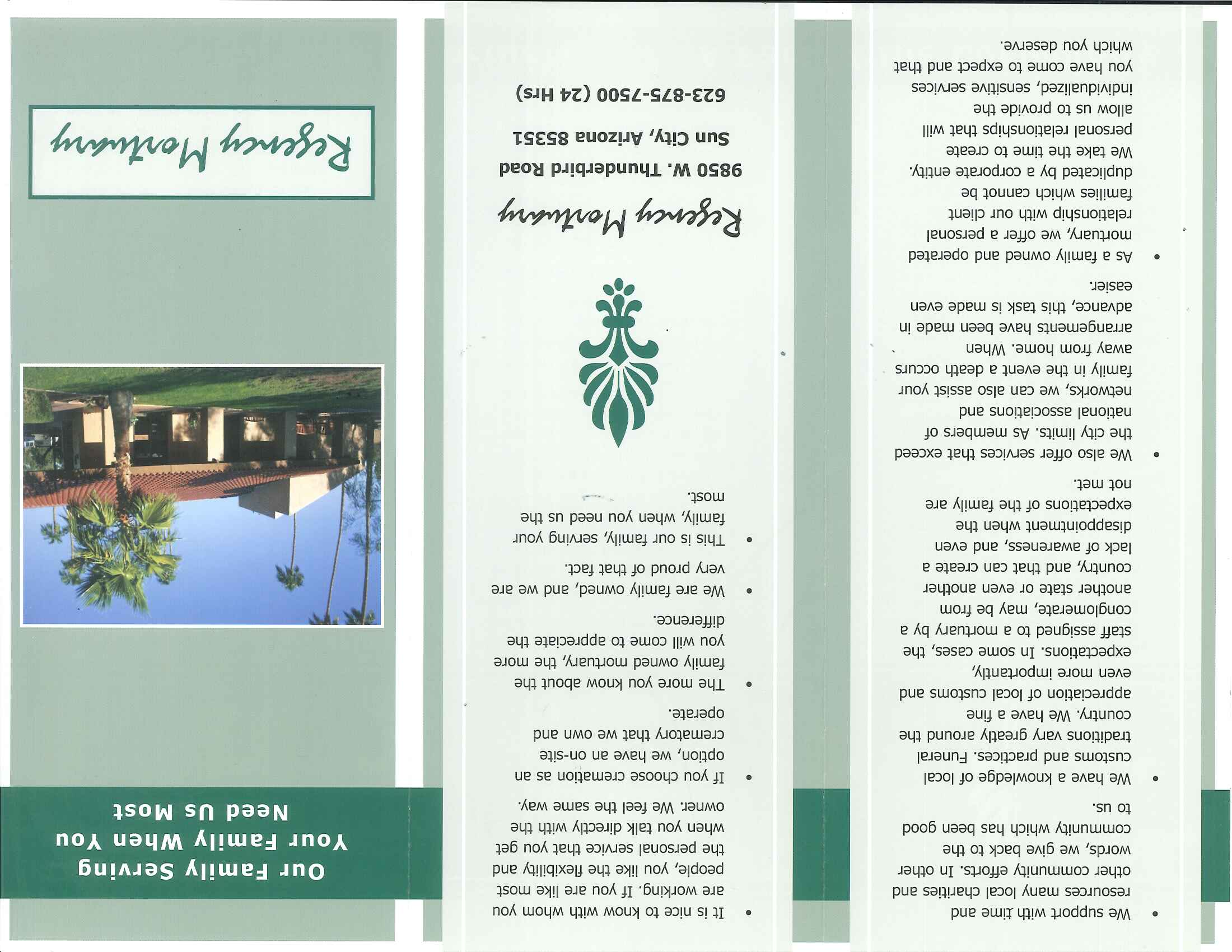We need to have a tri-fold brochure designed for our mortuary. The name of the mortuary is Regency Mortuary. The purpose of this brochure is to give consumers and decision makers an easy glimpse into our business.