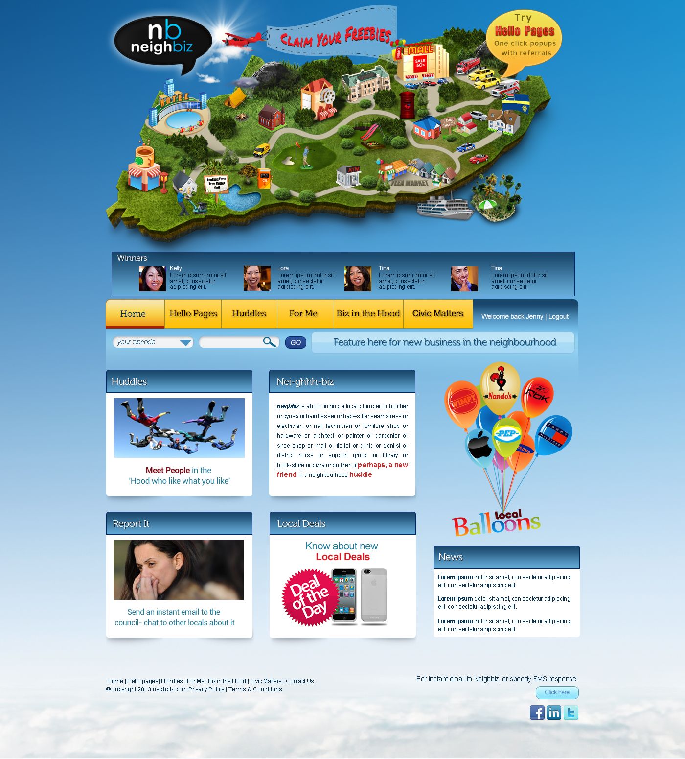 Reason: There are thre thrusts to neighbiz 1) looking for FUN web page, playful - on the current "island" look the idea is one clicks on... and it gives a lits of local taxi companies, places of worship, local police station, local malls etc -I think it is too cluttered, and possibly something cleaner? Is all about the ICON /IMAGE telling the story... 2) locals can put out balloons which when "popped" show a prize / special offer from a LOCAL business or service, for local people in the 'hood.